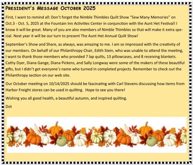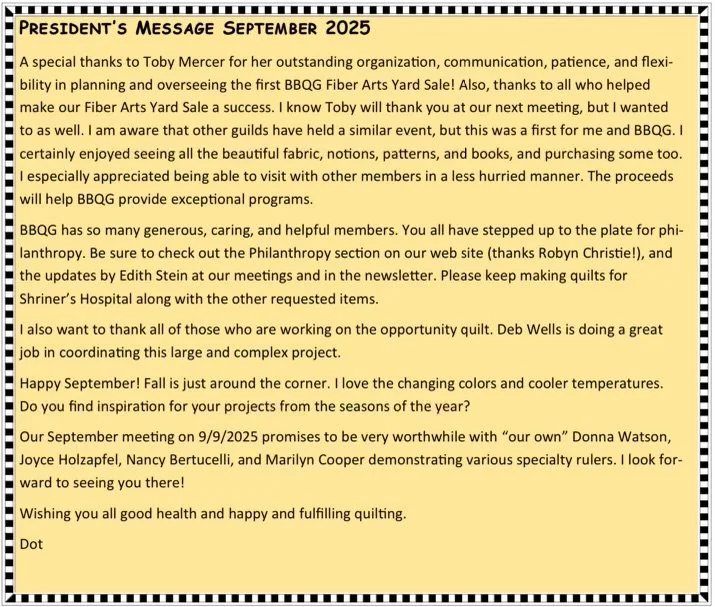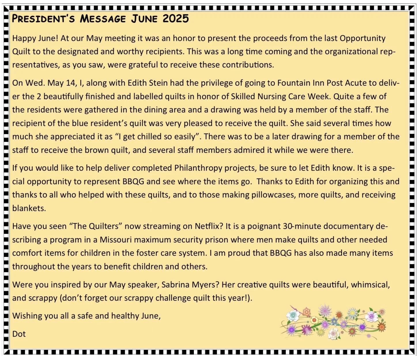 Wow, that was cold - January, I mean! Let’s hope that was the last of the really cold weather we’ll see this year. What projects have you been working on so far this year??? Are you finishing up your 2023 Block of the Month quilt for inclusion in the Mancuso show or maybe entering one on your own? Have you given any thought to your entry in our own Busy Bees quilt show in October? I’m working on those projects and more as I have a list of personal goals I’m trying to achieve. It just depends on the day, I guess. I don’t know about you, but some days I feel ready to take on a big challenge and jump right in and other days I’m happy to pick up a work in progress or a smaller project for one of our deserving philanthropies or our upcoming boutique. Still other days even sewing on binding, or a quilt label gets me closer to checking something else off that list. Whatever your reasons may be, I hope that you make time in your day to do what brings you joy and peace. As always, I look forward to seeing what you have created.