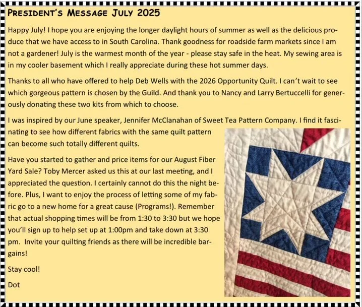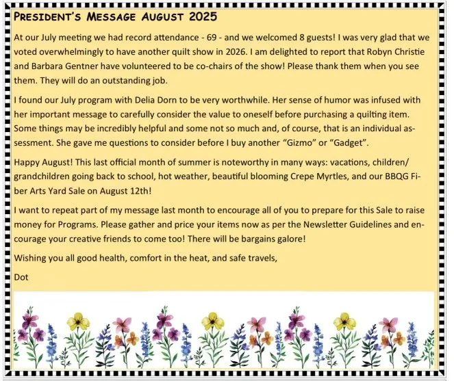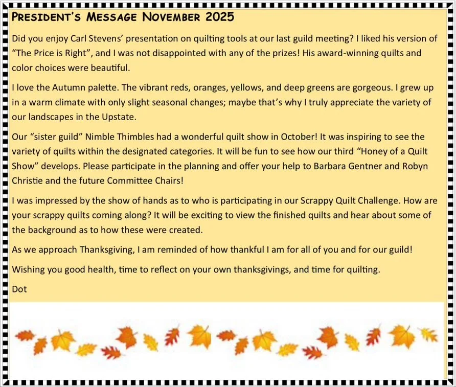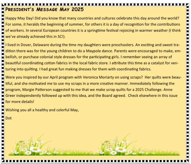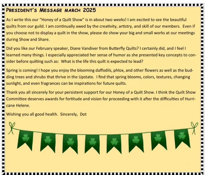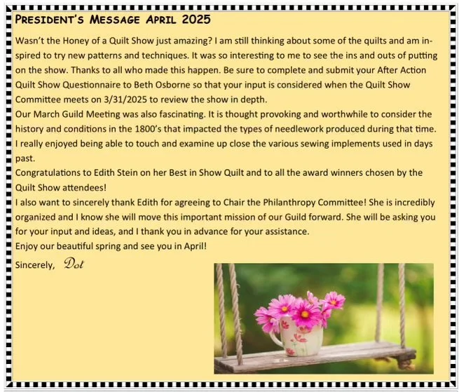 Congratulations to the following Busy Bees Quilt Guild Members who were unanimously elected to lead the Guild in 2025