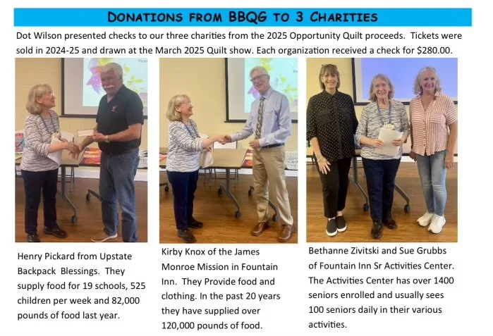 2024 - 2025 Busy Bees Quilt Guild Opportunity Quilt proceeds were awarded to the 3 Charities chosen by our guild